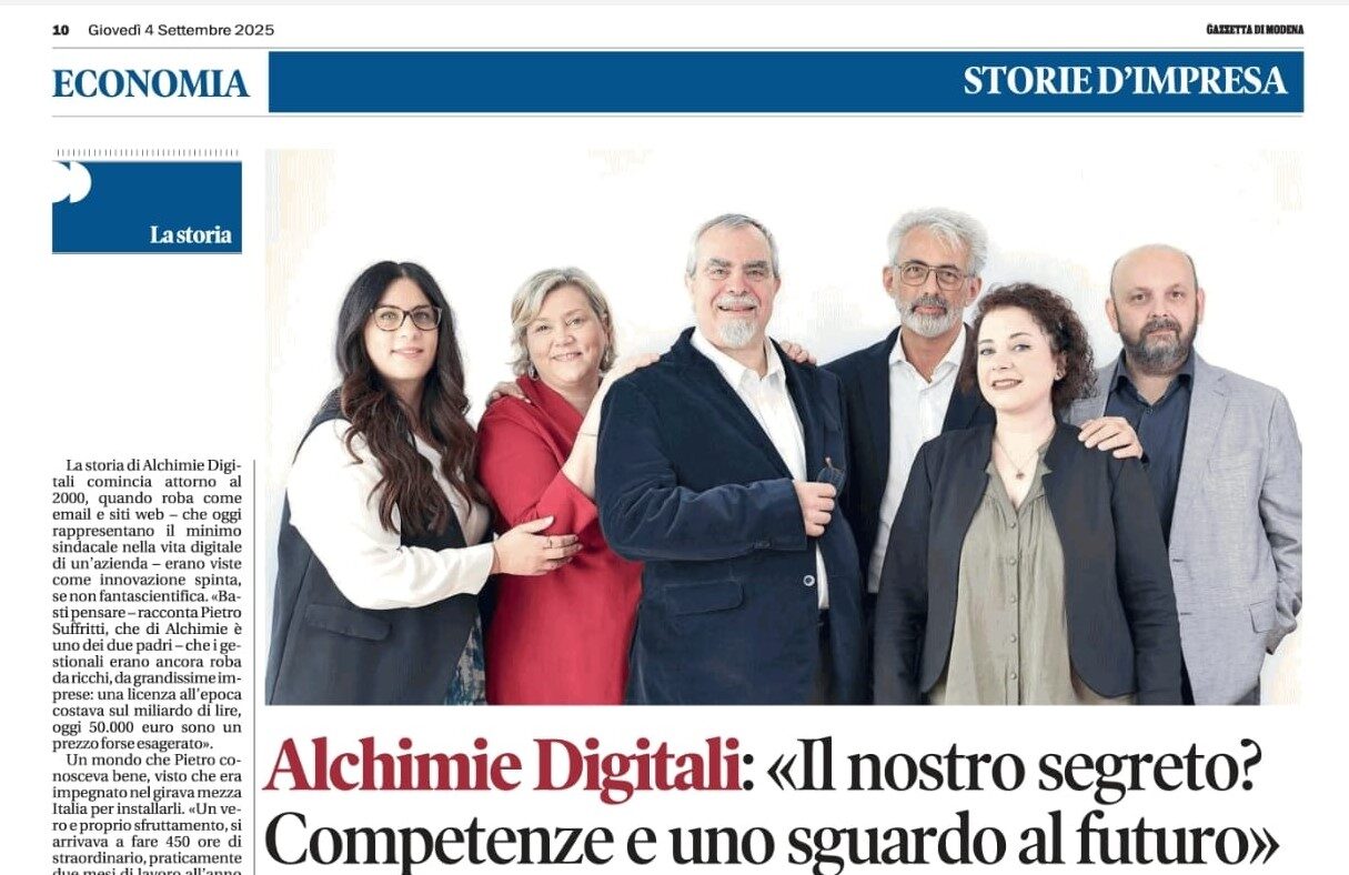 Oggi, 4 settembre 2025, la Gazzetta di Modena ha raccontato la storia di Alchimie Digitali, un percorso iniziato nel 2000 e che da allora non ha mai smesso di evolvere. Un riconoscimento che ci rende orgogliosi e ci spinge a guardare avanti con ancor più determinazione.