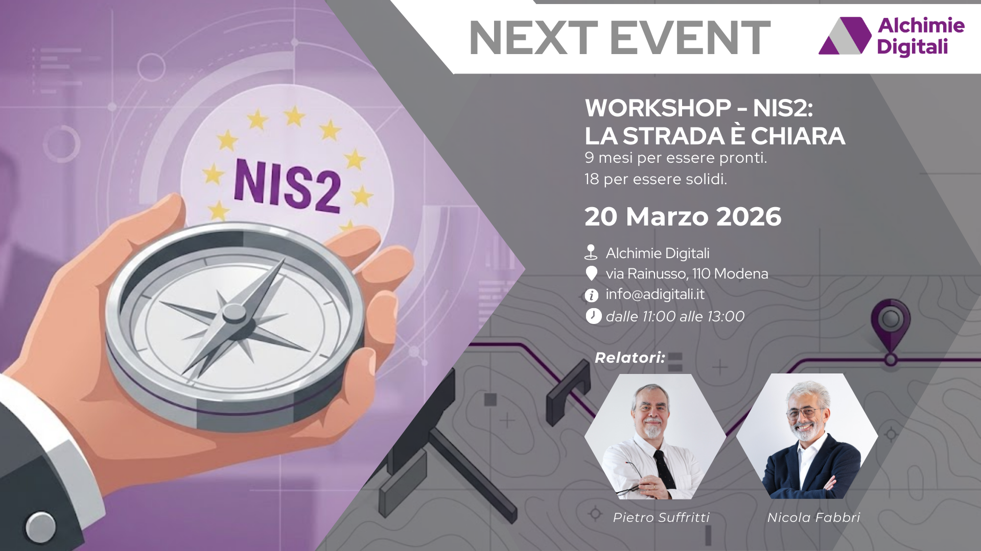 Il 20 marzo 2026 Alchimie Digitali Srl organizza un workshop operativo in presenza, dedicato alle aziende soggette alla Direttiva NIS2, pensato per trasformare l’obbligo normativo in metodo concreto e verificabile.